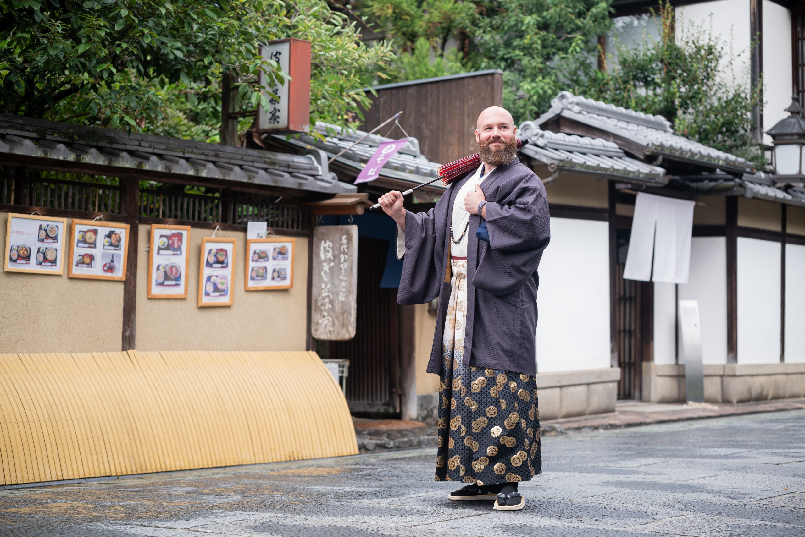 arming streets, historic shrines, and traditional cafes in a stylish men’s hakama?