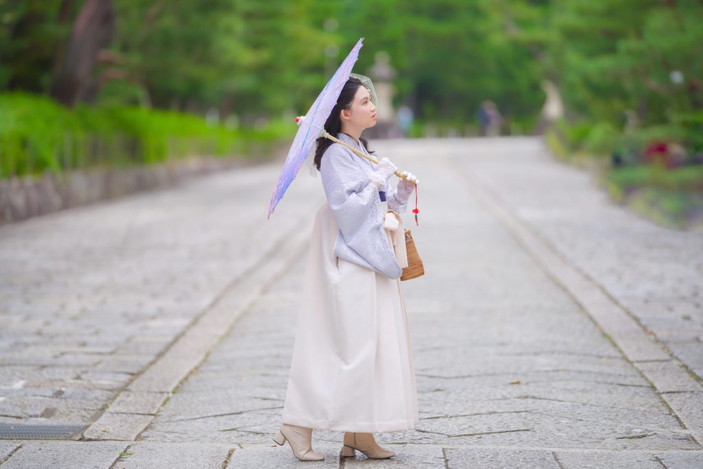 - Simple kimono × embroidered hakama: elegant and graceful